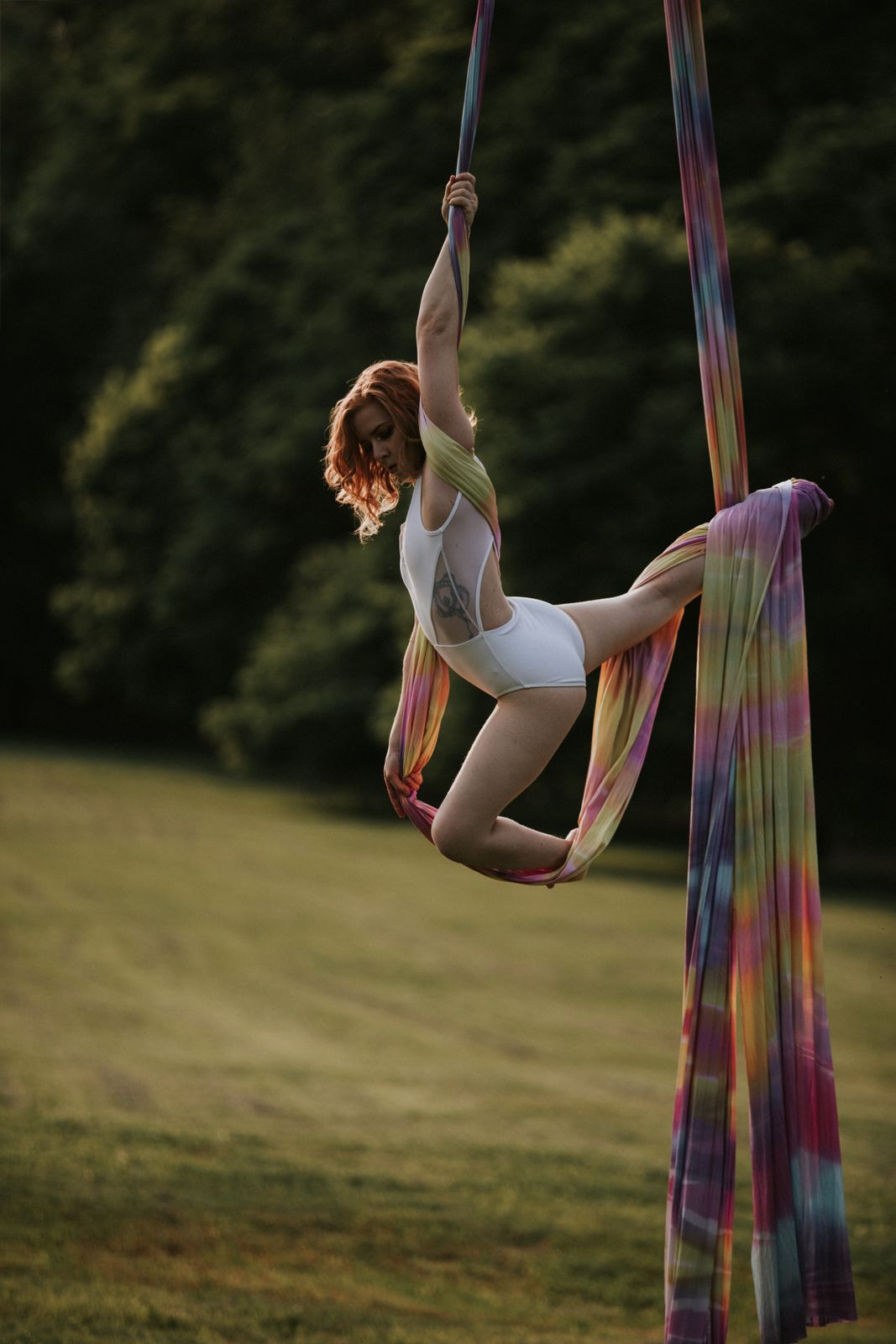TyeDye: Hand-dyed aerial fabrics are unique and artisanal, each piece boasting individual patterns and color variations created by hand. These fabrics often feature intricate designs and rich colors, making them perfect for adding a personal touch to your aerial practice. Also great for a statement or outdoor shoot !